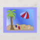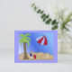 Un cadre cool au ciel bleu brumeux, un palmier et un grand parapluie rouge et bleu. Bouches, pelle et coquillages sur la plage de sable.