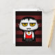 Joli vampire de dessin animé avec de grands yeux de chat jaune, habillé d'un gilet rouge et d'une cape noire.