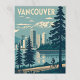 une carte postale rétro de Vancouver, Canada. Inclure la ligne d'horizon avec des tours en verre, adossées aux monts North Shore. Ajoutez les arbres à feuillage persistant de Stanley Park et un cycliste sur le sentier de la digue au premier plan. Inclure des réflexions dans l'eau de Burrard Inlet. Utilisez des tons turquoises, bleu marine et vert de forêt avec des vecteurs croustillants et une stylisation géométrique. Mettez en valeur l'atmosphère moderne et propre de la ville, avec un air vintage."