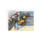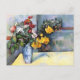 Une carte postale d'art avec la peinture post-impressionniste de l'artiste français Paul Cézanne, (1839-1906), Still Life Flowers in a Vase (1888). Une nature morte avec des roses rouges et jaunes disposées dans un vase en porcelaine bleu et blanc à motifs sur une table.