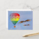 Hot Air Balloon et deux oiseaux volent dans un ciel bleu avec des nuages faibles. Le ballon a des bandes arc-en-ciel de rouge, orange, jaune, vert et bleu. Les oiseaux ont des ailes brunes. Le dos de la carte a le titre "Viens voler avec moi."