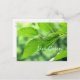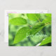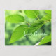 Montrez votre soutien pour l'environnement et un mode de vie vert avec cette carte postale qui vous encourage à "Vivre Vert". Un gros plan de feuilles d'été verdoyants après une pluie. ~ Partie de la collection verte. ~