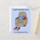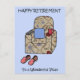 Un fauteuil à l'allure confortable, à motifs chintz, avec une paire de chaussons devant, accompagné des mots "Bonne retraite à un Vicaire Merveilleux".