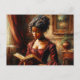 This postcard features a wealthy Victorian black woman reading--a richly detailed artwork of a dark-skinned woman in a deep red gown, absorbed in a book as she sits by the window. With her elaborate hairstyle, pearl earrings, and timeless surroundings, the image evokes classic elegance and historical romance.