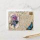 Une carte postale française à l'ancienne, écrite à la main, offre un cadre magnifique pour le bouquet de fleurs et le papillon bleu dans le coin.
