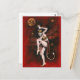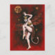 Cette carte postale est illustrée par une dame diable vintage placée devant un arrière - plan rouge avec une lune gothique et des étoiles.