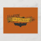 Une bannière jaune orangé est au centre de ce design avec un look usé et vintage. Le mot "Halloween" court sur toute la longueur de la bannière avec le mot "Happy" au-dessus de celui-ci, qui dit "Happy Halloween". Une chauve-souris noire aux ailes étirées et aux yeux rouges juste en dessous de la bannière donne une touche légèrement déplaisante au design. À partir de mon numériquement d'origine créé image.