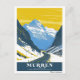 Cette affiche de voyage vintage capture la beauté intemporelle de Murren, Suisse. Doté des majestueuses montagnes de l'Eiger, du Monch et de la Jungfrau, il s'agit d'une pièce idéale pour tous ceux qui aiment voyager, voyager en Suisse ou concevoir de manière vintage.