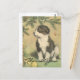 Image de Noël à l'illustration vintage représentant un chiot assis sous l'arbre de Noël.