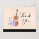 Une fête merci carte postale avec un design féminin. Illustré d'une aquarelle représentant un violon en bois, des pantoufles de ballet rose se reposent contre elle et sont décorés de fleurs et de papillons. Placez-vous sur un arrière - plan rose pêche. Message sur le dos qui peut être personnalisé.