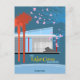 Carte d'affiche de style voyage dans le milieu du siècle moderne couleurs et éléments. Ranch home, palmiers et tabebuia rose emblématique. De plus, le gardien du quartier, le Lion McBride, qui traîne sur le porche avant.