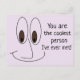 Cherchez-vous une carte postale amusante pour un ami ? Que diriez-vous de cette carte postale de dessin animé souriant cool qui dit aussi : "Vous êtes la personne la plus cool que j'aie jamais rencontrée !" imprimée en lettres noires cool à côté du visage de dessin animé. Parfait pour en envoyer un à tous vos amis préférés !