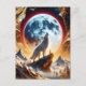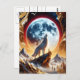 Un loup blanc se dresse sur un pic rocheux, hurlant à une grande lune bleue avec un halo rouge. La scène se déroule sur fond de montagnes enneigées et d'une forêt lointaine.