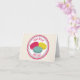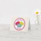 Un carte pour notes comportant une illustration de trois macarons français (rose, bleu, et jaune) à l'intérieur d'un cercle rose et bleu décoratif avec le texte rose "Bonjour" et "bonjour." Masquez à l'intérieur.