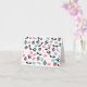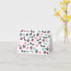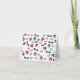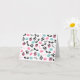 Un carte pour notes comportant un motif des macarons français bleus et roses, des caniches noirs, des lunettes de soleil de plot réflectorisé, des boîtes-cadeau roses attachées avec un ruban noir, et du "Bonjour !"