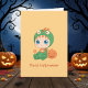 Bébé adorable habillé d'un costume de dragon vert avec des pointes orange et un bib orange assorti au crâne. Un citrouille incurvé se trouve juste un peu derrière. Texte personnalisable.