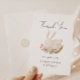 Un joli carte de remerciements de premier anniversaire roux présente un lapin dormant à l'eau douce sur un lit à fleurs et à feuilles de saumons. Sur le devant est un magnifique script de calligraphie de remerciement, et le dos comprend un message de remerciement personnalisable avec un adorable lapin. Cette carte peut être personnalisée pour n'importe quel âge !
