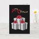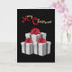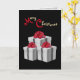Des cadeaux gris et blancs avec de grands nœuds rouges font un motif charmant pour vos invitations de vacances. Les cadeaux se détachent sur le fond noir. Les lettrages rouges et dorés ajoutent une touche de fête ! L'intérieur est à rayures grises et blanches. Personnalisez-le avec votre message et votre nom