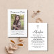 Dimensions de la carte : 3,5 po x 5 po. Cette simple carte de prière commémorative peut être donnée en souvenir lors d'une célébration de la vie ou d'un service funéraire ou envoyée en hommage spécial à ceux qui n'ont pas pu y assister. Personnalisez cette carte avec une photo préférée et votre choix de prière ou de poème. Facile à customiser photo et tout le texte. Nos plus sincères condoléances à vous et à votre famille pendant cette période difficile.