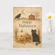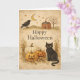 A charming, primitive-style Halloween illustration with a homespun, folk-art feel. Set against a softly aged parchment background, a peaceful hilltop scene unfolds beneath a crescent moon and scattered stars. A small country house with glowing windows and a bare autumn tree sits in the distance while a crow watches from above. In the foreground, cheerful jack-o’-lanterns and pale pumpkins rest among tied wheat sheaves and fallen leaves, accompanied by a wide-eyed black cat. The naïve shapes, warm earth tones, and simple composition evoke early American folk art and vintage harvest décor.