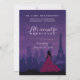Commencez votre quinceañera avec la spectaculaire invitation parisienne de nuit dans les teintes sombres de violet et de rose. L'horizon parisien comprend la Tour Eiffel et d'autres monuments sous un ciel nocturne plein de feux d'artifice qui explosent. Personnalisez avec tous les détails pour le service de masse, la réception et la fête du 15ème anniversaire. Également disponible en rose bordeaux et ardoise bleu/rose combinaisons. Coordination des éléments d'invitation et de fête disponibles. Aussi approprié pour un événement sweet sixteen.