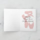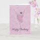 Souhaitez à votre ballerine préférée un "Joyeux anniversaire". Arrière - plan tourbillonnant rose avec joli dessin de la ligne de danseur dans la posture arabesque. Message à l'intérieur au-dessus des chaussures à pieds roses.