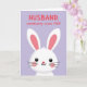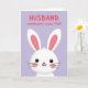 This card features a simple graphic of a friendly white bunny near the lower part of the front, looking up with an affectionate, “thinking of you” kind of gaze 🐰. Two extra-long ears stretch upward, with soft pink inner details that add a gentle, romantic touch. The bunny’s face is minimal and cute, with small black eyes, a tiny red nose, a slight curved mouth, faint pink cheeks, and a few thin whiskers. Behind it, a smooth lavender background keeps the scene calm and tender, letting the white figure stand out clearly. Near the top, a short pun-style message sits centered in bright red text, easy to spot against the purple backdrop. The spacing leaves plenty of open area between the text and the bunny, giving the design a relaxed, sweet rhythm. Small pink accents and that red nose create a subtle “love note” feel without needing extra decoration 🌷. The bunny’s long ears rise into the upper space, pointing toward the red lettering above.
