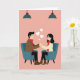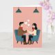 This card captures a quiet, meaningful moment between a man and a woman seated in teal armchairs facing one another. Their hands meet gently in the center, symbolizing closeness and emotional connection. A soft pink background surrounds them, while three small white hearts float above, hinting at love that doesn’t need words. Both wear red scarves, adding warmth and passion to the scene. Simple hanging lamps above the chairs create a cozy, intimate atmosphere. Their relaxed expressions and subtle smiles reflect comfort and trust. The balanced colors and thoughtful details come together to tell a story of calm affection and shared moments, making this card a beautiful way to express love on Valentine’s Day.