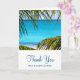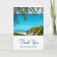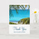 Un carte de remerciements mariage plié avec une belle photo d'une plage tropicale turquoise avec de grandes frondes de palmiers vertes encadrant la scène. Message personnalisé dans la carte.