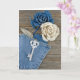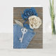 Roses Denim en poche jean bleu avec clé antique sur bois de grange rustique.