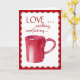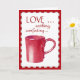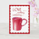 Une tasse rouge chaude de thé ou de café, avec la poignée en forme de demi-coeur, l'autre moitié réfléchit sur la tasse elle-même. Un cadeau merveilleusement subtil pour la personne spéciale de votre vie pour la Saint-Valentin, un anniversaire, un anniversaire ou juste pour dire bonjour, vous me manquez ou je vous aime. Jolie carte, carte postale, autocollant, aimant, bouton, mousepad, sac, tablier, t-shirt.