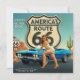 Un design audacieux et rétro inspiré de la Route 66, avec son panneau routier emblématique, une décapotable bleue classique et une pose glamour de pin-up sur fond de désert du Sud-Ouest - parfait pour les amateurs de road-trip, les fans d'Americana et la décoration de garage rétro
