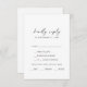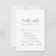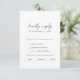 Cette carte RSVP de choix de script moderne est parfaite pour un mariage minimaliste. Le design simple en noir et blanc présente une typographie industrielle unique avec style boho moderne. Personnalisable dans n'importe quelle couleur. Gardez le design minimal et élégant, en l'état, ou personnalisez-le en ajoutant vos propres graphiques et artwork. Cette carte de réponse mariage demande aux clients quel repas ils souhaitent à la réception.