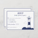 Une carte RSVP simple et élégante avec l'illustration d'un phare aux tons bleu marine pour un mariage marin et nautique ! Changez simplement les informations et envoyez-les à vos invités !