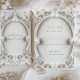Cette carte RSVP témoigne de la grandeur du design baroque, invitant vos invités à répondre avec la même opulence qui fera honneur à votre jour de mariage. La carte est ornée d'un luxueux tableau de rouleaux blancs sculptés et de feuilles acanthus, créant un cadre riche en trois dimensions sur un arrière - plan crème subtil. L'ovale central offre un espace pour le texte personnalisé, avec une police simple mais élégante qui complète les détails complexes. Cette carte RSVP sert non seulement son but, mais sert aussi de garant de la célébration somptueuse à venir, conçue pour donner une impression durable d'anticipation et de grandes festivités.