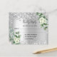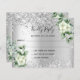 Un faux arrière - plan métallique d'aspect argenté, décoré de confettis, de fleurs blanches, de fleurs et de verdure d'eucalyptus. Personnalisez et ajoutez la réponse par date et vos noms.