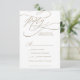 Cette carte RSVP de demande de chant de calligraphie dorée romantique est parfaite pour un simple mariage. Le design classique moderne comprend des tourbillons fantaisistes et des fleurs fantaisistes avec une magnifique typographie de feuille d'or en faux champagne. Créez votre liste d'invités mariages et votre liste de chansons de piste de danse tout à la fois ! Cette carte de réponse mariage demande aux invités s'ils pourront assister à votre mariage, et aussi quelle chanson les amènera à danser. Remarque : Ce design ne comporte pas de véritable feuille d'or. C'est un graphisme de haute qualité fait pour ressembler à du papier doré.