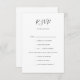 Cette carte RSVP simple et élégante est parfaite pour votre mariage moderne minimaliste noir et blanc. Le design comporte une police contemporaine minimale accompagnée d'une calligraphie formelle. Gardez-le tel quel, ou choisissez de le personnaliser avec vos propres oeuvres d'art ou photos !