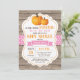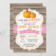 Carte rustique d'invitation de baby shower de fille de citrouille avec l'arrière - plan en bois rustique. Pour davantage de personnalisation, cliquez sur svp la "personnaliser il" bouton et utilisez notre outil de conception pour modifier ce modèle.