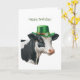 Carte de voeux d'anniversaire avec une aquarelle illustrant une vache noire et blanche ornée d'un chapeau vert avec une bande d'or et une fleur blanche et des shamrocks. Bonne salutation de fin d'après-midi sur le devant. À l'intérieur des caractéristiques les salutations - Espérons que votre journée est passée fantastique. Joyeux Brithday !