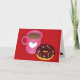Illustration d'une beigne glacée au chocolat, garnie d'arroses et servie avec une tasse de café dans une tasse rose au coeur.
