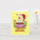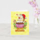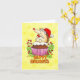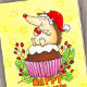 Cette carte montre un tout petit hérisson portant un chapeau de santa. Il est heureux de s'asseoir sur un cupcake de Noël, grignotant sur la baie rouge qui était sur le dessus. Le pudding à la prune est de la taille d'un gâteau de tasse et est emballé dans une tasse de papier rose. De petites branches de pins et des brindilles aux baies rouges d'hiver ont été disposées autour comme décor. L'arrière - plan est jaune avec un motif étoilé orange et défraîchi. Sous le cupcake est écrit "Joyeuses fêtes" en apportez des lettres orange.