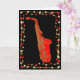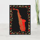 Le design saxophone Festive de Noël présente un saxophone alto rouge et jaune doré stylisé encadré de cordes de lumières de Noël.