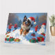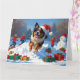 Illustration de vacances pleine de charme avec un chien gai jouant dans la neige, portant un chapeau de Père Noël et entouré de boîtes cadeaux colorées. Dans l'arrière - plan, les enfants construisent un bonhomme de neige à côté d'un sapin de Noël enneigé, créant un merveilleux pays hivernal. Parfait pour répandre la joie des fêtes et capturer la magie de Noël.