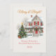 Apportez la magie des fêtes dans vos salutations avec cette charmante carte de Noël représentant une maison rouge confortable décorée de guirlandes, de rubans et d'un arbre magnifiquement illuminé recouvert de neige.