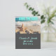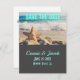Moderne, vertical non traditionnel Save the Date annonce présente scène de la plage (qui comprend des vagues et des étoiles de mer dans le sable) photographie arrière - plan avec Save the Date dans un néon bleu aqua. Personnalisez avec les détails du couple mariage sur l'arrière - plan gris foncé. Ajoutez des informations supplémentaires et un code QR personnalisé à l'arrière.