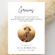 "Découvrez le réconfort dans notre 'Carte de remerciement photo de funérailles espagnoles Script Gracias'. Avec une police de calligraphie 'Gracias' élégante sur le devant, cette carte est une expression sincère de gratitude. Personnalisez cette carte avec un court mot de remerciement, une photo précieuse, un nom et une durée de vie, pour un hommage attentionné. Notre carte personnalisable offre du réconfort pendant le deuil, servant de 'merci' sincère en espagnol. Ses détails de calligraphie et sa touche personnelle créent une carte de gratitude mémorable significative. Exprimez votre appréciation sincère et honorez une mémoire chère avec cet hommage photo de deuil, offrant réconfort et gratitude dans un moment difficile."