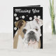 Ce portrait de Bulldog britannique est si triste, avec de grands yeux marron et triste expression dressée contre un arrière - plan à motifs floraux noir et blanc. Le texte modifiable dit "Missing You" Parfait pour envoyer à quelqu'un qui vous manque pendant le verrouillage.