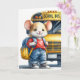 Une petite souris anthropomorphique portant une chemise rouge et un jean bleu se tient devant un bus scolaire jaune portant un sac à dos jaune. Le message interne peut être modifié.