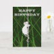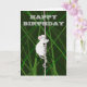 Une souris de champ grise, dans un champ d'herbe verte haute, escalade une brindille, sa longue queue enroulée autour de la brindille pour support. Le message à l'intérieur de la carte dit "Avoir un anniversaire merveilleux, atteindre les étoiles! "